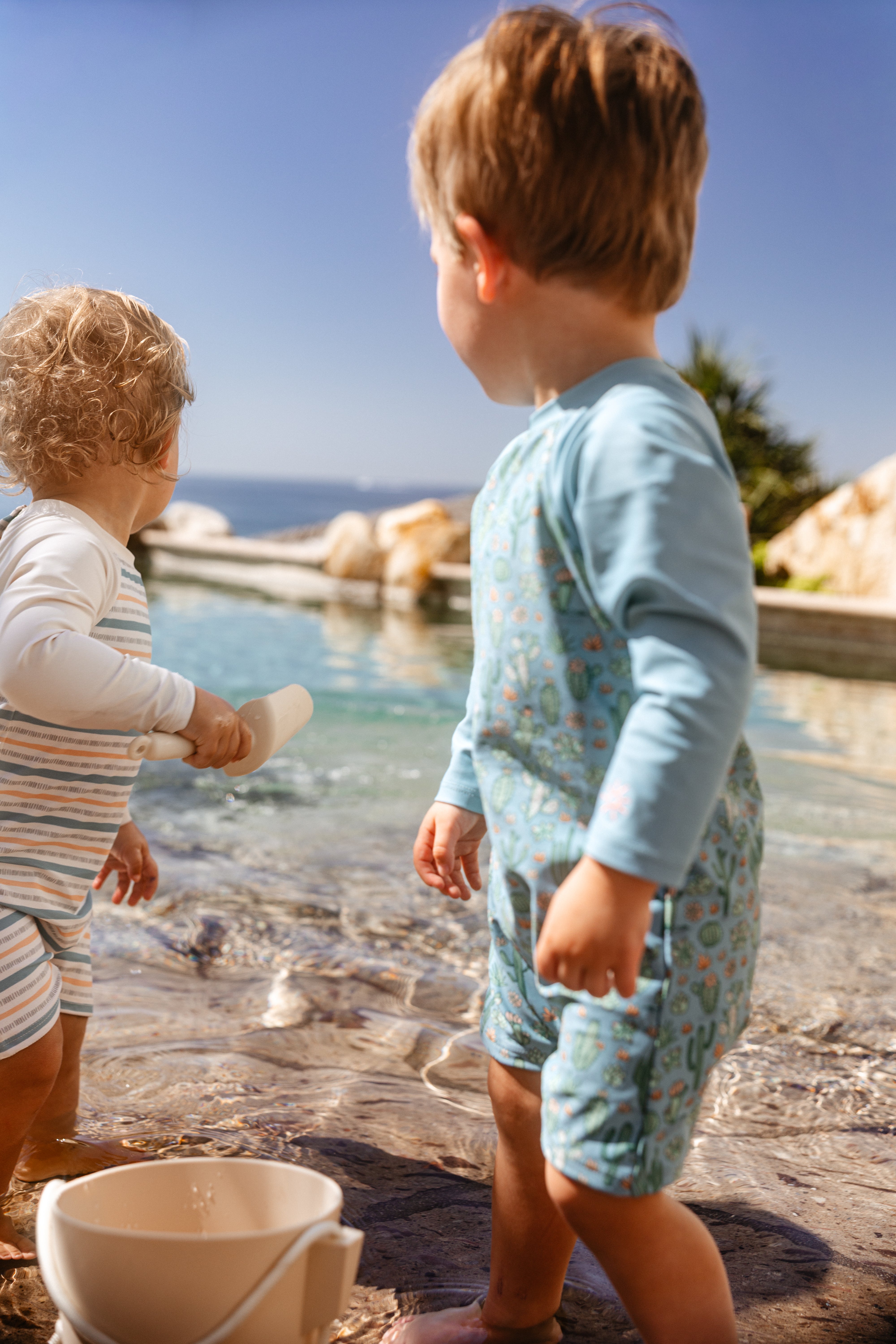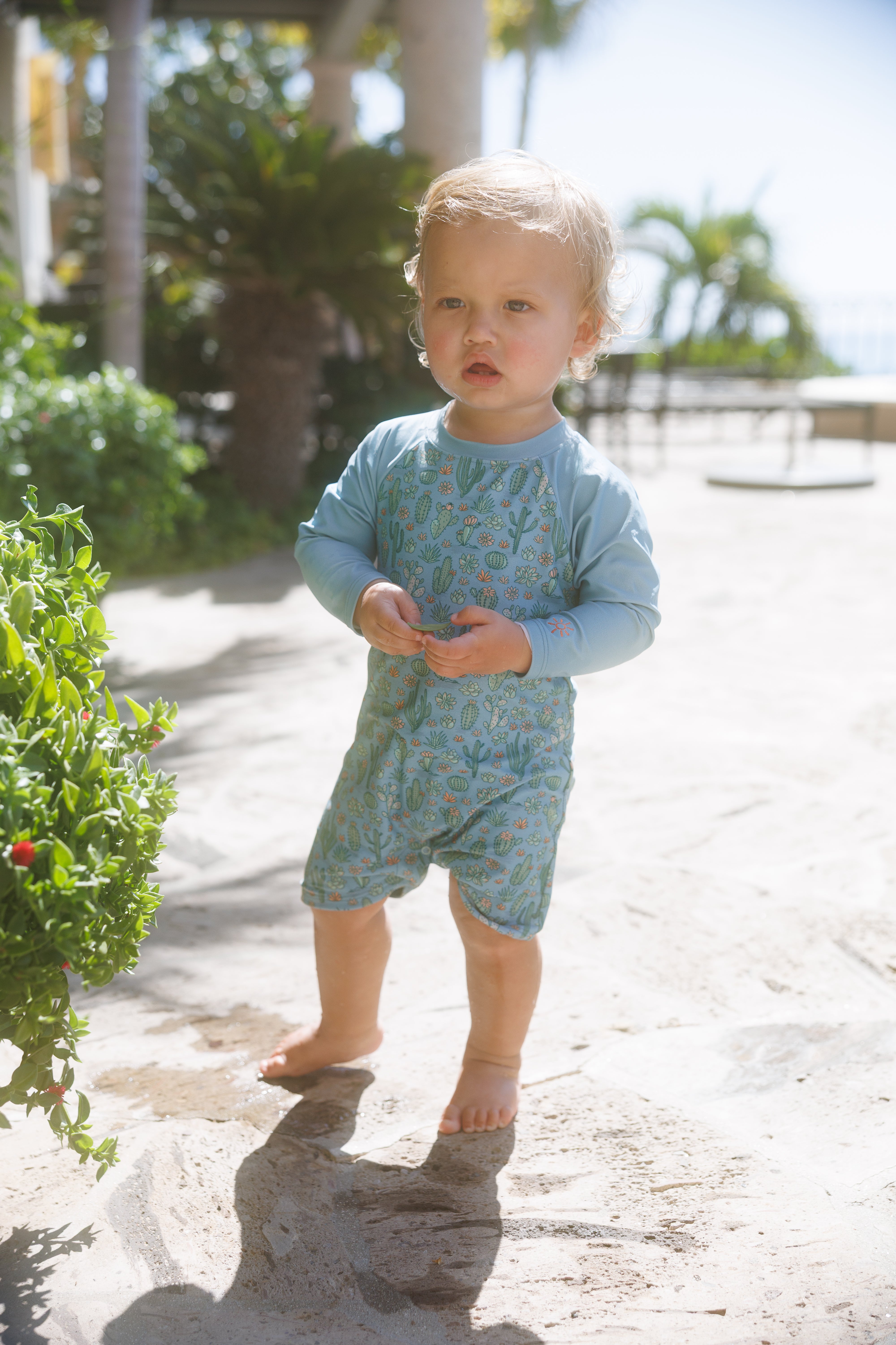 A thoughtfully designed swim onesie for your little one in recycled polyspan fabric, offering UPF 15 protection and lightweight stretch for all-day play. This style has snaps at the back and leg for an easy outfit change.
